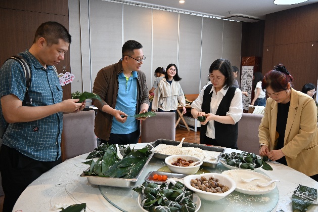艾草菖蒲挂件制作完成后,教职工们围坐两桌,开启了一场其乐融融的包粽子活动。有经验的老师热心指导初学者:取两片宽大粽叶折成圆锥状,放少量糯米压实,加入肉、蜜枣等馅料,再覆糯米包严,粽绳缠绕扎紧,一个个结实的粽子便在指尖快速成型。老师们彼此交流经验,互相学习,包粽子速度突飞猛进,桌面上的粽子很快堆积起来,形态各异、惹人喜爱。